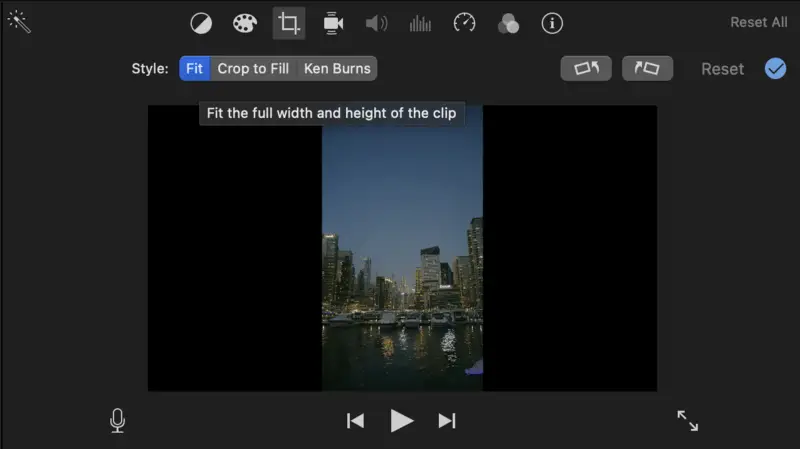 The Fit tool adjusts the clip to fill the entire frame without cropping. This means that iMovie will preserve the original aspect ratio but you will see black bars on the sides of the frame.